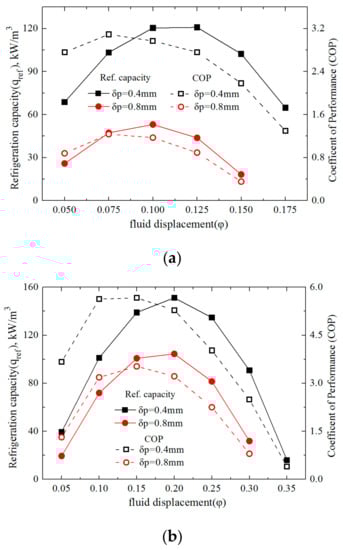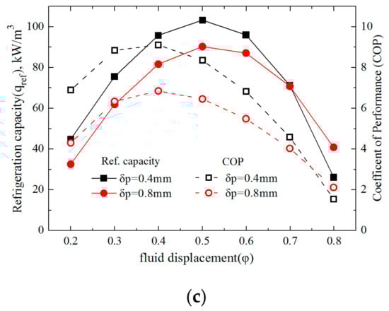 The variations of the specific refrigeration capacity and the Coefficient of Performance with relative fluid displacement under the cycling periods of 0.5, 1 and 4 s, respectively, are presented in Figure 2a–c, with the double vertical coordinates where the two plates’ thickness (δp = 0.4, 0.8 mm) were adopted in the AMRs.