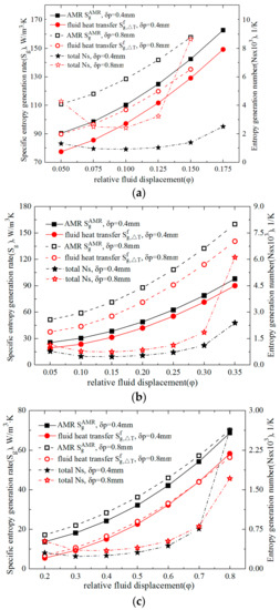 The variations of the entropy generation number (Ns), i.e., the total entropy generation rate normalized by the refrigeration capacity, with fluid displacement (φ) under the conditions with cycling periods (τ) of 0.5, 1 and 4 s are presented in Figure 3a–c, respectively, with the right vertical axes. It is clear from the right axes of Figure 3 that the Ns varied concavely with the increment of φ for all the τ values, and that thinner Gd plates facilitated a smaller pit Ns. Moreover, the smallest pit Ns were obtained by adopting the largest τ. Specifically, for the AMR manufactured by 0.4mm thick Gd plates, when the τ was 0.5, 1 and 4 s, the generated pit Ns were 9.1 × 10−4, 4.7 × 10−4 and 2.4 × 10−4 K−1, respectively, and the corresponding optimal φ was 0.1, 0.15 and 0.3.