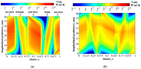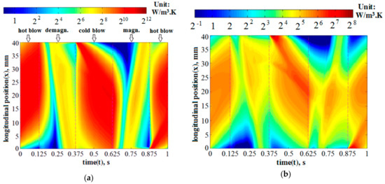 By scrutinizing the subfigures in Figure 4 or Figure 5, it is clearly seen that the fluid was much larger than the solid . Moreover, during the hot or cold blows, both and considerably increased with the increment of fluid displacement (φ). Contrastingly, as the fluid stayed stationary during the magnetization and demagnetization, the and in those processes were found to have no significant dependence on φ. All the contours are consistent with the curves of entropy generation rates in Figure 3.