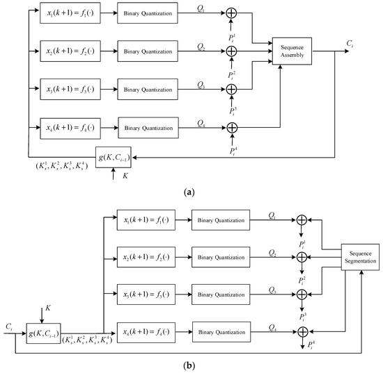 Where , , and function represent the seed key, subkey, exclusive OR (XOR) operational character and subkey generation function, respectively. and are the ciphertext stream generated at two adjacent moments. , , , and are the quantized chaotic binary sequence. , , , and are the adjacent plaintext stream with the purpose of parallel encryption. According to Equations (1) and (2), , , , and can be given as Equation (4).