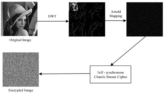 In this section, a novel image encryption scheme is proposed based on self-synchronous chaotic stream cipher, Arnold mapping, and two-dimensional discrete wavelet transform (DWT). The encryption process of the proposed scheme is shown in Figure 3. Firstly, the spatial domain of the image is transformed into the frequency domain by two-layer DWT. Secondly, Arnold mapping is implemented with the purpose of obtaining good diffusion effectiveness. Finally, on the basis of self-synchronous chaotic stream cipher, the scrambled image is encrypted to ensure its security.