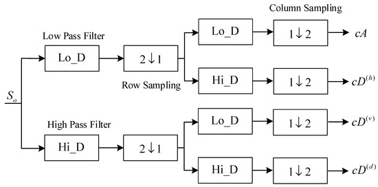 The DWT plays an important role in image compression and image information processing. The decomposition process of signal by the two-dimensional DWT is shown in Figure 4. A two-dimensional matrix can be decomposed into four groups of coefficients . Where , , , and represent approximate coefficient (low frequency component), horizontal detail coefficient, vertical detail coefficient, and diagonal detail coefficients, respectively. Furthermore, the approximate coefficient can continue to be decomposed by the same method. On the basis of the above image encryption scheme, in order to obtain the transformation coefficient, the pixel value of the grayscale image is processed by two-dimensional discrete wavelet transform. Thereafter, the spatial domain of the digital image is transformed into the frequency domain with the purpose of enhancing the pixel scrambling effect.