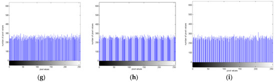 The histogram of the image is an important statistical feature of the image. It can be considered as the gray density function of the image. One of the evaluation criteria of image encryption effect is whether the gray histogram of the ciphertext image has the characteristics of uniform distribution. The results of the grayscale histogram are shown in Figure 5, and the horizontal and vertical coordinates of the gray histogram represent the pixel values and number of pixel values, respectively. As can be seen from the Figure 5g–i, the pixel values of the ciphertext images are so evenly distributed that it is difficult for the attacker to extract the plaintext pixel statistical characteristics from the ciphertext. Therefore, this image encryption scheme can resist statistical attacks well.