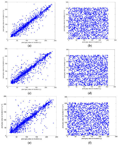 The correlation plots of two adjacent pixels for the plain and encrypted images of Lena with: (a) horizontal correlation of plain-image of Lena; (b) horizontal correlation of cipher-image of Lena; (c) vertical correlation of plain-image of Lena; (d) vertical correlation of cipher-image of Lena; (e) diagonal correlation of plain-image of Lena; (f) diagonal correlation of cipher-image of Lena.