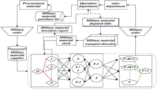 As shown in Figure 1, military supplies are delivered stage by stage from the starting point of sending orders to the endpoint. This paper mainly analyzes the content highlighted with a dotted line which represents the process that military supplies are transported from the starting point to the endpoint. This process is explained as follows: military supplies are firstly delivered from the points between 1 and N to the points between L and T. Also, the military supplies can be transported in the points between L and T mutually without limit of directions. Then, the military supplies are transported to the points between and V. Through the analysis, there are three different types of road network nodes which are the starting points from 1 to N , the transit points from L to T and the endpoints from to V. Different nodes have their own inventories and different inventories have their own constraints.