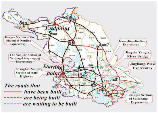 Finally, they arrive in Lianyungang and Xuzhou, which are the military supply storage sites and also the endpoints. Road transportation is the main transport approach as air and railway transportations are easy to be noticed by the enemy. Therefore, the high ways that have already been built are selected to be the road sections of the transportation. The specific route could be seen from Figure 7 which is highlighted with black lines.