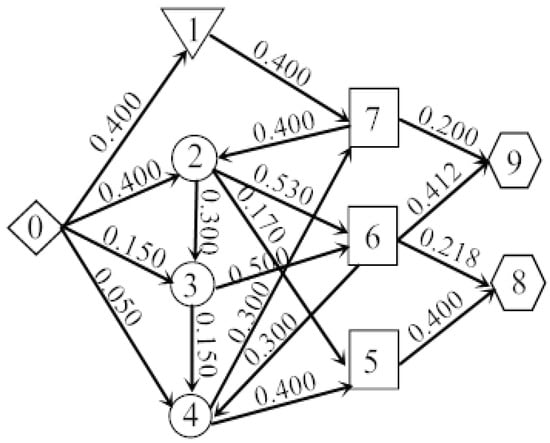 In conclusion, the optimal flow distribution model for different types of nodes is constructed based on the objective function of the military supply transportation, namely Equation (15), and the network constraint conditions, namely Equations (16)–(24). The application of this model and the calculation process are illustrated in the next section.