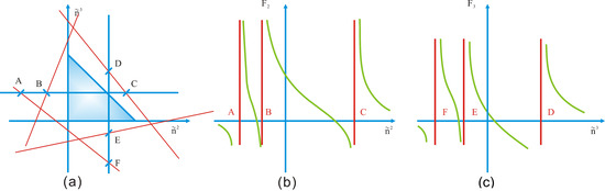must be monotonically decreasing in the direction of increasing . Because of this property, when is increased to approach a singular hyperplane while all the other variables are kept constant, . When is decreased to approach a singular hyperplane while all the other variables are kept constant, . Additionally, when while all other variables are kept finite, decreases and approaches zero; when while all other variables are kept finite, increases and approaches zero. Figure 1 shows, qualitatively for a three-phase system, the monotonicity of and to and .