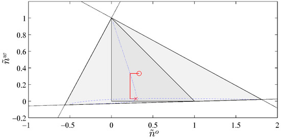 Red line ended with circle and cross marks the path of convergence for the three-component, three-phase example presented in Table 1. Circle is the initial guess and cross is the converged solution. The smaller shaded triangle is the domain of the physically permissible solutions. The larger shaded triangle is the domain defined by Equation (6) including the negative flash region. The dashed lines are the singular lines. The dotted lines inside the larger shaded triangle correspond to and , the intersection of which is the converged solution.
