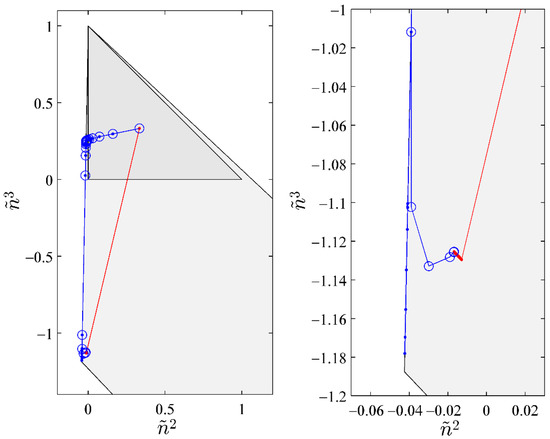 Paths of convergence for the case presented in Table 2. Red line with dots is the path of SS-RR, blue line with dots is the path of NM-RR, and blue line with circles is the path of the hybrid method. The graph on the left shows the entirety of the paths and the graph on the right focuses on the final convergence.