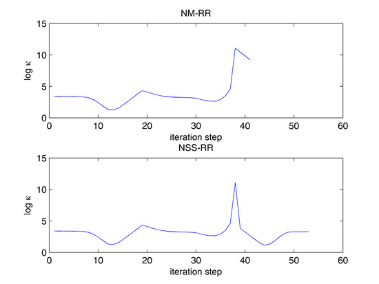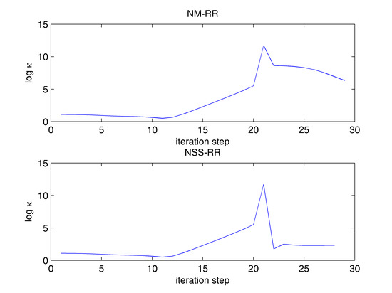 Variations in the condition number of Jacobian during NM-RR and NSS-RR iterations for the twenty-component, five-phase example.
