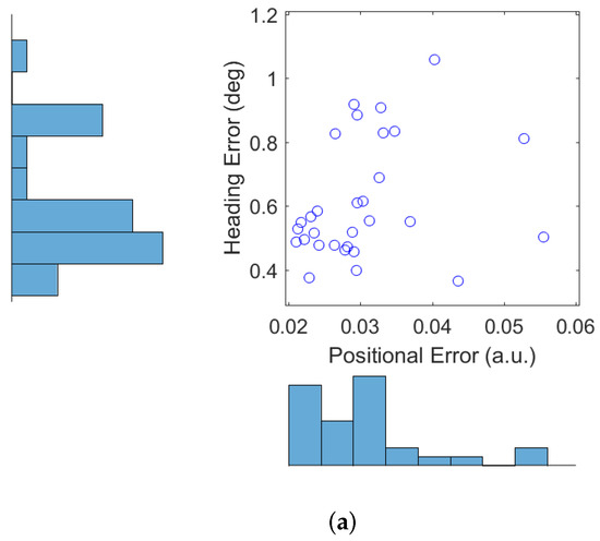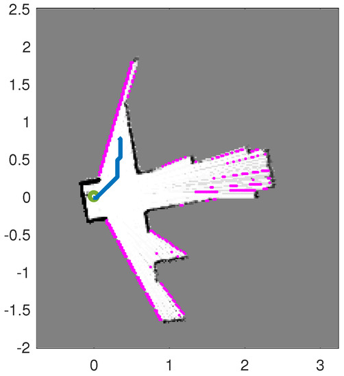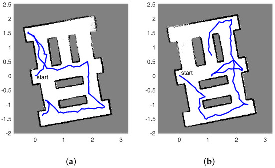 Figure 3 displays two estimated maps created by the described autonomous RFS-OG-SLAM for the scenario shown in Figure 2. An estimated map at time k is reconstructed from the probability of occupancy vector , computed as the average of particles , . The maps are tilted because the initial pose of the SLAM algorithm is set to a zero vector. Figure 3 also shows the estimated paths created by the autonomous RFS-OG-SLAM (the blue lines). An estimated path is constructed from the two first components of the mean of the pose particles , . Duration of exploration and mapping is expressed in the number of discrete-time steps required; the maps in Figure 3a,b required 85 and 98 time steps, respectively. The quality of an estimated map at time k is expressed by the entropy of vector , defined as: