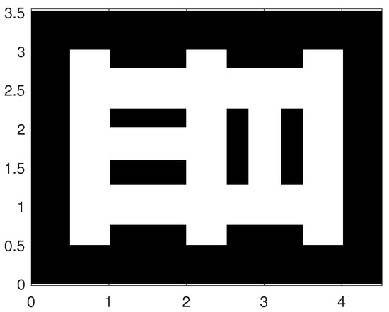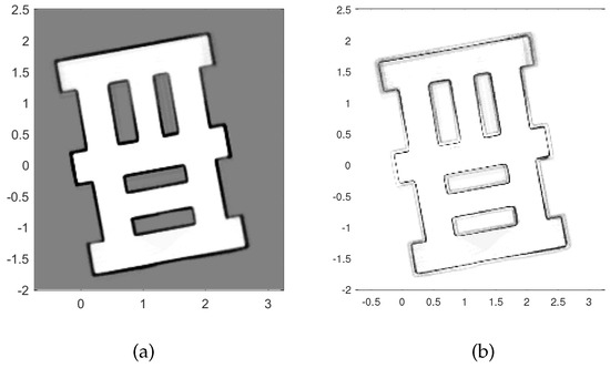 Figure 2 shows the map of the area used in simulations for testing and evaluation of the proposed path planning algorithm. The true initial robot pose (distance is measured in arbitrary units, a.u.) is . The SLAM algorithm is initialised with particles of equal weights, zero pose vectors and the probability of occupancy for all cells set to . The simulated ranging sensor is characterised with a coverage of 360°, angular resolution 0.8°, and if the distance between the robot and n-th cell is less than a.u. False detections are modeled with and as a uniform distribution over the field of view with the radius . Standard deviation is set to a.u. for range measurements and 0.3° for angular measurements. The occupancy-grid cell size is adopted as a.u. The number of particles . The parameter of the Rényi divergence is set to . The mission is terminated when none of the clusters of frontier cells has more than 14 members.