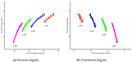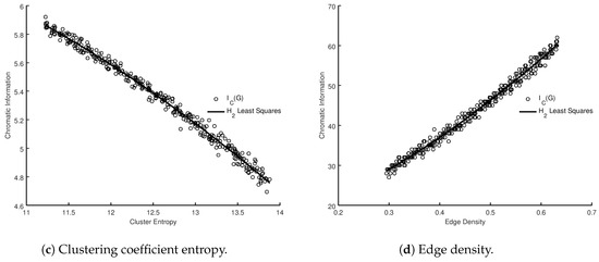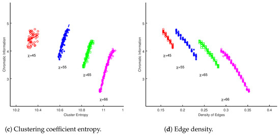 Again, it is important to stress that this is not a rigorous derivation of a relationship between chromatic information and vertex entropy, but it is possible to explain some of the correlations in the results presented in Figure 1. For a given fixed value of , the experiments represent graphs produced with increasing edge densities. As edges are added to the graph that do not increase the chromatic number, the size of the chromatic classes will evidently equalize (a discussion of this point can be found in [4]). This will have the effect of increasing the chromatic information, until a point is reached where . At this point, the denominator of Equation (28) will increase, causing a drop in chromatic information. Therefore, as each vertex entropy measure is fundamentally dependent upon the number of edges in a fixed sized graph, we would expect to see a series of correlations for each value of chromatic information, which is indeed what is demonstrated in Figure 1.