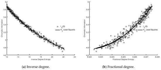 The data for the scale-free graphs is displayed in Figure 1. We have segregated the plots by the calculated chromatic number for the graphs and overlaid the optimal least squares fit model. It is suggestive that, for graphs that share the same value of , there is a non-trivial, strong correlation between the metrics. To gain insights into the nature of this correlation, the data was fitted using a least squares approach to polynomials up to the 5th degree. In Table 1, Table 2, Table 3 and Table 4, we applied both the BIC and AIC to identify the best model. We have highlighted the row for the model with the strongest performance in the BIC test, and the is measured from the model, which performs worse in both analyses. In each case, there is strong support for the existence of a strong correlation between the vertex entropy measures and chromatic information. Both AIC and BIC have a marginal preference for higher order polynomial models, with rejection of higher order, indicating a preference for for inverse degree and edge density. The other measures require higher order fitting, over , necessary for fractional degree and for cluster entropy.