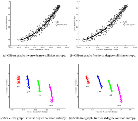 Following on from the observation in Section 1.4, we performed our calculations using the same vertex probabilities, but converted into a collision entropy using Equation (13). We restricted our analysis to inverse degree and fractional degree for brevity, as the results are somewhat similar to the regular Shannon entropy variants of these measures. We present the results for both Gilbert and scale-free graphs in Figure 3. Similar to the results using Shannon entropy, visual inspection would indicate a strong correlation between the local and global measures, and this is borne out in the model selection analysis summarized in Table 9, Table 10, Table 11 and Table 12. The results of the model selection analysis are also broadly in line with the Shannon entropy case, favoring a quadratic and cubic relationship, with curiously inverse degree favoring a linear model. We conclude that the analysis supports that, even with an alternative formulation of entropy based upon vertex probabilities, there is a strong correlation between the local and global values.