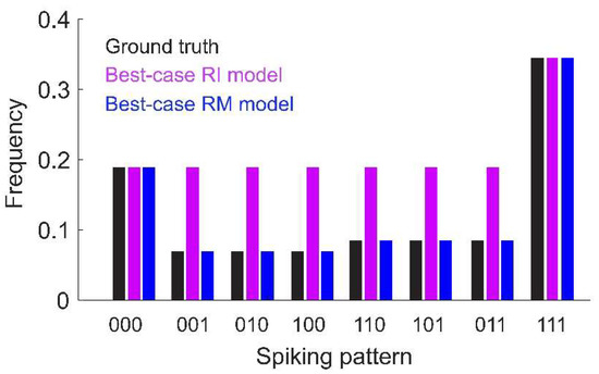 Toy model of N = 3 neurons with only first- and second-order interactions. Ground-truth probabilities are shown for each spiking pattern (black). Also shown are the frequencies predicted by the best-case (i.e., assuming infinite data and fitting time) Reliable Interaction (RI, magenta) and Reliable Moment (RM, blue) models (assuming a threshold of 0.1). Under these assumptions, the RM model would fit the ground-truth frequencies exactly. The RI model exactly fits the frequencies for spiking patterns above threshold, but is inaccurate for rare patterns. Note that the RI model cannot be normalized because the fitted partition function does not match fitted interaction terms (see main text and Appendix A for a detailed explanation). Model parameters: (see Equation (3)).