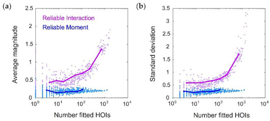 The Reliable Moment (RM) infers fewer strong, spurious higher-order interactions. (a) Average magnitude of all fitted higher-order interaction parameters as a function of the number of fitted higher-order interactions, shown for both the Reliable Interaction (RI; magenta) and RM (blue) models. Note that all higher-order interactions should have magnitude 0. Points represent 50 random ground-truth models (i.e., random interaction parameters), each of which is fitted 20 times with varying threshold parameters (see Methods). Solid lines indicate the RM and RI fits to a specific example ground-truth model. (b) Same as (a) but for standard deviation.