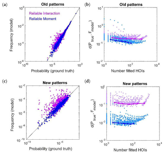 The Reliable Moment (RM) model is able to predict the probabilities of new spiking patterns. (a) Reliable interaction (RI; magenta) model frequencies and RM (blue) model probabilities of previously observed spiking patterns plotted against ground-truth probability, for an example ground-truth model. Each point represents a different “old” spiking pattern (i.e., occurring within both test and training datasets). For a fair comparison, we chose an example in which the RM and RI models had the same number of fitted interaction parameters (in this case, 395). (b) Dissimilarity (see Methods) between ground-truth distribution and model distribution of spiking patterns over different numbers of fitted higher-order interactions. Points represent 50 random ground-truth models (i.e., random interaction parameters), each of which is fitted 20 times with varying threshold parameters. Solid lines indicate the RM and RI fits to a specific example ground-truth model. (c,d) Same as (a,b) for new spiking patterns (i.e., those observed in the test data but not observed in the training data).