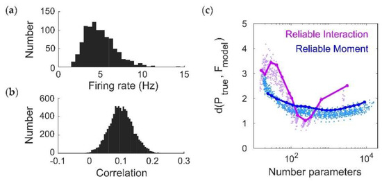 We generated population spiking patterns under the resulting distribution using Gibbs sampling (equivalent to 200 s worth of data) [22,25]. Figure 2c shows the fitted moments of a RM model for an example simulated population dataset (). This choice of threshold parameter identifies all 20 units, and 154 pairs (out of 190 possible) as having moments above threshold, which are fitted via MPF learning to reproduce the sample moments from the training data (blue; for comparison, the 36 pairs that were not included in the fitting are shown in red). The model is able to reproduce the probability distribution of spiking patterns in a “test” dataset that was not used to fit the model (Figure 1d), as well as the firing rates and correlations (Figure 1e; including the pairs that were not explicitly used for fitting, in red). This choice of model also identifies 108 higher-order moments (103 triplets and 5 quadruplets) as being above threshold. Since the ground truth model is pairwise, ideally their interaction parameters should be zero after fitting. Because of sampling noise in the data, as well as idiosyncrasies of MPF learning (see Discussion), they are nonzero but small on average (magnitude 0.235 ± 0.231).