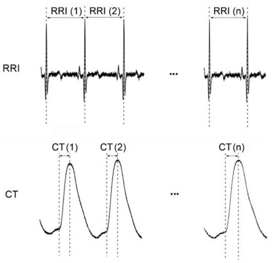 RRI time series {RRI(i)} = {RRI(1), RRI(2), …, RRI(1000)} and CT time series {CT(j)} = {CT(1), CT(2), …, CT(1000)} for each participant were obtained from photoplethysmography (PPG) and electrocardiogram (ECG), respectively. One thousand stable consecutive cardiac cycles were obtained from ECG together with the recording of digital waveform signals from PPG within the same period (Figure 1).