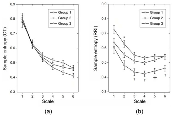 MSE analysis of CT series of the three groups of participants showed that, although the three groups tended to separate from scale 2 onwards, there was no statistically significant difference among the three groups (Figure 2a, Table 2). For sample entropy of RRI, although the three groups appeared to be separated from scale 1 onwards, significant difference between Group 1 and Group 2 was noted only at scale 2. By contrast, Group 3 had significantly lower sample entropy compared to that of Group 1 and Group 2 from scale 3 onwards (Figure 2b, Table 2).