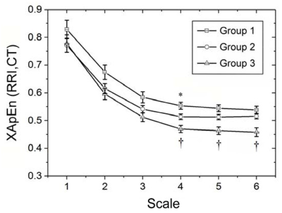 Multiscale cross-approximate entropy analysis of synchronized R-R interval (RRI) and crest time (CT) time series showing changes in cross-approximate entropyof the three groups of testing subjects with time scale 1 to 6. Group 1: Healthy young subjects; Group 2: Non-diabetic upper middle-aged subjects; Group 3: Diabetic upper middle-aged subjects; * p < 0.017 (p corrected): Group 1 vs. Group 2; † p < 0.017: Group 2 vs. Group 3.