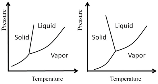 Schematic phase diagram of a normal liquid (Left) and water (Right). Note the different slopes of the solid-liquid equilibrium lines.