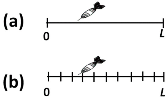 Transition from the continuous to the discrete case. (a) A dart hits a one-dimensional segment of length L. There are infinite possible locations for the dart; (b) Passage from the infinite to the discrete description of the states.