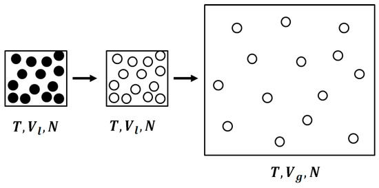 Our interpretation of the entropy of vaporization consists of two steps, shown schematically in Figure 3. We start with one mole at with entropy value . We first “turn off” the interactions at constant T and V. The resulting change in entropy is: