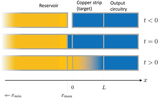 Schematics of “new” electron injection. Initially (), the target is separate from the large reservoir of “new” electrons, which in this simple scheme extends from a faraway starting coordinate to . At time , the reservoir is put in contact with the target (for instance, with a switch that contributes a small amount of copper), and electrons can flow () from the source towards the output circuitry. Light orange marks a high density of “new” electrons, while blue marks a low electron density. The “output circuitry” stands for the rest of the circuit, where electrons eventually drift.