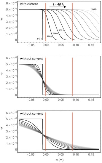 Probability density function (pdf) for finding a single “new” electron with a reservoir that has a volume about -times larger than the target (corresponding to about 0.25 m of copper, with a mass of about 2.2 metric tons), with and without current. The red vertical bars mark the start and the end of the target; the reservoir is attached with a 1-cm connector to the target, and to obtain clearer figures, the diffusion constant has a value that is 100-times smaller than the true one. Top panel: pdf with a 40-A current at times 0 s–1000 s after connecting the external reservoir. The curves are taken at 100-s intervals and are labeled with the corresponding times (except the middle ones), as well as with different gray levels. Initially, the pdf is a uniform distribution with a sharp step at the boundaries of the reservoir; a large part of it is in the reservoir and is not shown. Eventually, in this case after about 1000 s, the right-propagating step of the pdf moves beyond the target, and the distribution inside the target is uniform. Middle panel: pdf without current. The curves are labeled with gray levels only. Bottom panel: pdf without current over a longer time span, up to 10,000 s, with 1000-s intervals. This is a limiting case that corresponds to a reservoir that is connected to the target, which would however never occur in practice because the no-current case corresponds to a disconnected reservoir (and therefore, to no newly-injected electrons).