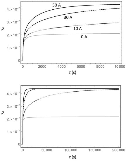 Figure 2 illustrates what happens in two different situations—without current and with current—when we consider the experimental arrangement of Figure 1: it is quite clear that the signal development, which is associated with the probability of finding a “new” electron in the target, is very different in the two cases. With current, electrons from the source travel fast and soon fill the whole target, even though, in measurements without current, the electrons that diffuse from the reservoir into the target also produce a signal; however, this takes more time, and the “new electron” density is lower than in the case with the current.