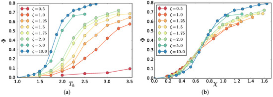 of the chains are coupled to a “cold” Langevin thermostat with temperature and the other half to a “hot” Langevin thermostat of . Each thermostat is coupled to the system by the same coupling friction . In the original work on polymers, Ref. [10] was chosen to be rather high to be comparable to the overdamped limit used in other works [11] and to observe phase separation at relatively low thermostat temperatures. The critical temperature of the hot thermostat decreases with increasing friction (see Figure 1a) because the heat transfer from the thermostat to the particles becomes more efficient, which increases the difference between the effective temperature of the hot and the cold particles. As mentioned in [10], a natural asymmetry parameter of the system is which captures the relative difference in the effective temperatures and (one third of the mean squared velocity) of the hot and cold components, respectively. We use because of its low sensitivity to the choice of friction as shown in Figure 1b, where we compare order parameter profiles for different frictions for the system of chains. The order parameter used is , where x is the average inter-chain like-particles number fraction in a neighborhood i.e., if inter-chain cold-cold monomer contacts are equally likely to hot-cold . As can be seen in Figure 1b, some systematic variation with still remains, which we leave for future study.