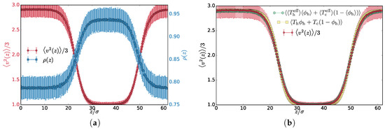 The phase separation occurs because the local difference in temperatures gives rise to a pressure difference that is compensated with a density change by the redistribution of the particles. In steady state, the mass transport is suppressed, and heat flow is mostly localized at the interfaces. Therefore, in a separated steady state, the effective temperature and density exhibit non-constant profiles, while the pressure tensor component perpendicular to the interface is constant (hydrostatic equilibrium ). To investigate the profiles, we orient the interface perpendicular to the z-axis and align the different system snapshots by subtracting the center of mass from the coordinates. The average density exhibits a two-phase profile with two interfaces due to the periodic boundary conditions, as can be seen in Figure 2a for . We illustrate other properties of the system in figures with , but we measured the same properties for all the examined temperatures .