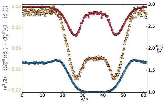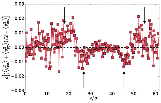 We computed the second (virial) part of the pressure tensor (3) as detailed in [19]. That is, the summation goes over particle pairs n and m connected by vector , which intersects a mid-plane of a slab at given z. The full pressure tensor exhibits a flat profile but unfortunately is too noisy (see Figure A3a,b). Therefore, we can not confirm numerically that the asymmetry shown in Figure 4 is present for the whole tensor, nor can we compute reliably the surface tension as the integral of the difference of its tangential and normal components. However, we observe that the system in the steady state is in mechanical equilibrium.