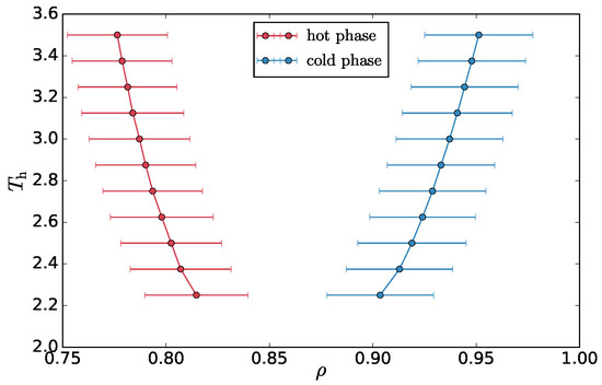 We use the plateau values of temperature, density and number fraction, in the average profiles of these quantities, to construct a phase diagram as a function of the . In Figure 5, we show the phase diagram for the overall density of the two phases and Figure A4a,b shows the number fraction of the hot particles and the msv, respectively.