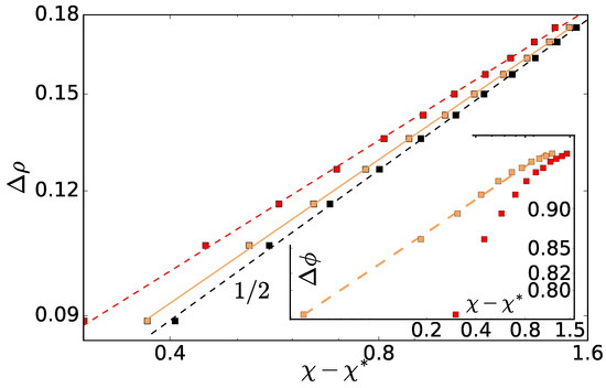 Density difference as a function of temperature asymmetry in log–log scale. Fits of are shown when (i) (orange) all three parameters A, and are fitted (values , and , respectively), (ii) only A and are fitted (, ), while is set to (black) and (iii) only A and are fitted (, ) while is set to (red). Note that the x-axis includes , which is different for the different fits, and, therefore, the data points look like three different sets. Inset: Difference in volume fraction of the hot particles as a function of the temperature asymmetry . Different curves correspond to different fitting procedures: (i) all three parameters are fitted , , (orange), (ii) was set to , but the curve does not exhibit a power law behavior (red). Similarly, the data are not consistent with a power law with exponent (not shown).
