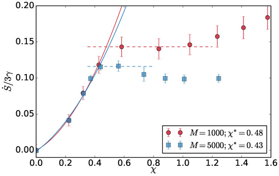 We measure the effective temperatures in the simulations and calculate the as above. The entropy production per particle grows with , until the two-dimensional interface develops in the system and then it plateaus (drops in the infinite system size limit). The is obtained as the crossover point between these two regimes. Here, in Figure 7, we compare two system sizes and .