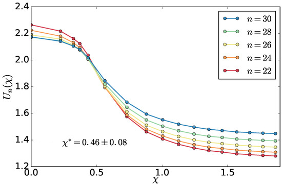 While the entropy production is affected by the choice of the fitting range above the transition point, which is affected by the finite size effects, the cumulant method relies on a proper choice of the value of n, which determines the linear size of the sub-box . This is to be larger than the correlation length and smaller than the overall system size, so the density fluctuations are not influenced by the fixed ratio of hot and cold particles in the system. As we don’t know these lengths a priori, we try a range of sub-box sizes for the system with chains and look at the cumulants crossings. The average crossing point represents an estimate of the critical point and standard deviation an estimate of the error. We select a range of sub-box sizes that gives a result found from the entropy production and use the same sub-box sizes to extract the critical point for the larger system. The result ( Figure 8) is consistent within the error bars with the result found with the entropy production method. Relatively small sub-box sizes were used as, with our brute-force MD simulations, we could not get too close to the critical point, and, therefore, the correlation length is also limited.