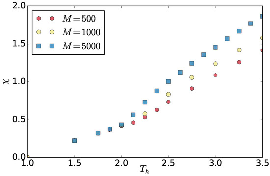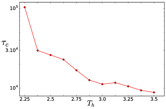 The different values of for different system sizes are the consequence of the fact that itself depends on the system size in the separated state. This is due to the fact that the interface represents a finite fraction of the finite system, the effective temperatures of the hot and cold components depend on the fraction and therefore on the system size. This is clearly visible in Figure 9, where one also sees that, in the mixed state, does not depend on system size.
