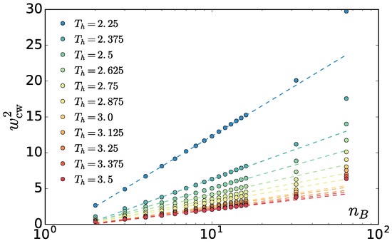 Mean square apparent interface width as a function of in log scale for various . Dashed lines are fits of Equation (A11) to range , although the log-linear regime extends well up to .