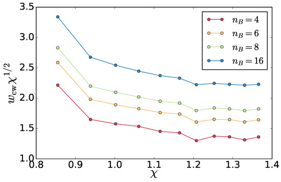 From the linear fit of versus , we can extract another estimate of the critical asymmetry as . Both methods give the same value , which gives credence to our analysis. This value of , agrees, within errorbars, with the one obtained from the cumulant method above (). Additionally, in Figure A6, we compare the present interfacial stiffness dependence with one obtained for a smaller system with . The values and the location of obtained from the width analysis agree very well with the ones found for the larger system.