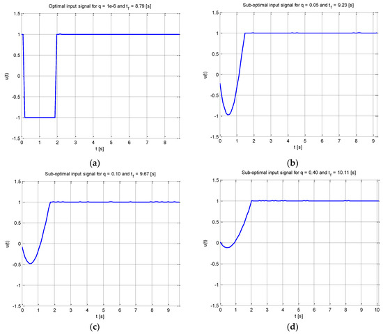 The D-optimal perturbation signal received when there was no constraint on the input energy component (i.e., for J1 = 0.88, qJ2 = 1.0 × 10−4 and tf = 8.79 [s]) is shown in Figure 1a. The input energy factor was increased (Figure 1b) to obtain the suboptimal input signal, which corresponds to performance index components values: J1 = 0.92, qJ2 = 5.00 and tf = 9.23 [s]. For comparison, Figure 1c shows the suboptimal input signal, which correlates with the objective function values: J1 = 0.97, qJ2 = 8.70 at the final time level of tf = 9.67 [s]. Figure 1d contains the graphical display of the suboptimal excitation received for the cost function integrants values: J1 = 1.01, qJ2 = 33.44, where time duration was tf = 10.11 [s].