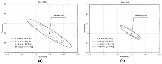 Eighty-eight computations were done when the plant model starts from various initial state condition, and the additional noise disturbing the system input has a different variance. Figure 3a contains the ellipsoidal confidence region (black dotted line) with the input signal obtained for the minimal value of input energy factor (i.e., q ≈ 0 and Deff = 90%), while Figure 3b shows the results (for the same values of initial states and noise variance) with excitation signals that were computed when an input energy coefficient increases its value and was selected as q = 0.10 (green dashed line) and 0.40 (red dash-dot line). To compare results, Figure 3 contains the graphical display of the ellipsoidal confidence region of parameter estimates, where the system (Figure 2) was perturbed utilizing a step input signal (blue solid line). The comparison of the ellipsoidal confidence regions of the plant model parameter estimates indicates some similarities. The D-optimal input signal, calculated for q ≈ 0, causes the minimal time duration of the parameter identification experiment and a minimal volume of the ellipsoidal confidence region of parameter estimates. When the value of the input energy factor increases, the area under the curve increases its size for the same initial conditions and noise variance values. Increasing the desired ratio of input energy constraint yields the increase in the input signal duration, but the excitation is safer for the plant. In such a manner, we avoid rapid switching of the excitation signal in the real identification experiments. The prediction error LS, and the relative squared error LEL estimators were compared based on maximum, average, and minimum residuals of the parameter values (Table 4 and Table 5).