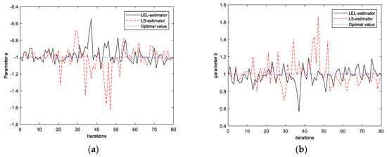 The comparison of the estimates values obtained using LEL (black solid line), and LS (red dashed line) estimators for various initial conditions, different noise variance, and D-efficiency value 90%: (a) confrontation between rival estimators for parameter estimate a based on the 80 runs; and (b) confrontation between rival estimators for parameter estimate b based on the 80 runs.