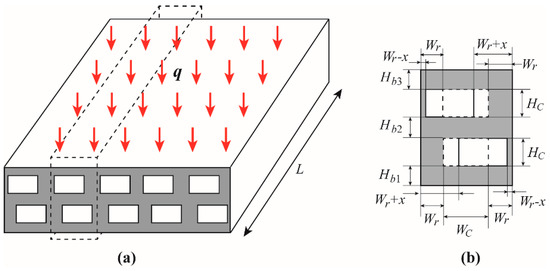 (a) Schematic of a staggered DLMCHS and the dashed line frame gives the repeated computational domain; (b) cross section of the repeated computational domain.