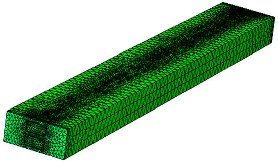 In the present work, COMSOL 5.3 is used to carry out the numerical analyses to study the thermal characteristics of the staggered DLMCHS. Meanwhile, the grid sensitivity test is carefully performed to keep the accuracy of the numerical analysis. An example of the grid sensitivity test is as following. Four different numbers of tetrahedral meshes are used during the grid sensitivity test: 5.7 × 104, 1.4 × 105, 2.7 × 105 and 3.2 × 105, and the corresponding maximum temperature and the relative errors of the maximum temperature relating to the mesh number are given in Table 1. Then, comprehensive considering the simulation efficiency and accuracy, the numerical analysis with 2.7 × 105 meshes is chosen and Figure 2 gives an example of the computational grid used in the present work.