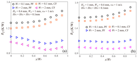 Based on the numerical analysis, Figure 3 gives the effects of offset on the thermal resistance of the staggered DLMCHS with different microchannel aspect ratios and different vertical rib thicknesses. From the results showing in Figure 3, it can be found there are three different variation trends of thermal resistance with the offset in the width direction both for the parallel flow (PF) and counter flow (CF). When the vertical rib thickness is small enough, for example Wr = 0.1 mm, the thermal resistance of the staggered DLMCHS shows an increasing trend with the increasing offset, which means the conventional DLMCHS with zero offset has the smallest thermal resistance and shows the best thermal performance. However, when the vertical rib thickness is large enough, for example Wr = 2 mm in the present work, the thermal resistance of the staggered DLMCHS decreases firstly and then increases as the offset increases, which means there is an optimal offset value for the staggered DLMCHS to achieve a minimum thermal resistance and improve the thermal performance. When the vertical rib thickness has an intermediate value, for example Wr = 0.5 mm, the thermal resistance of the staggered DLMCHS shows a much more complicated increasing trend in fluctuation. This means that shift between the upper microchannel and the lower microchannel in the width direction is a potential method to reduce thermal resistance and improve the thermal performance of the DLMCHS, especially for the DLMCHS with large vertical rib thickness.