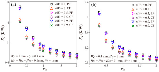 Additionally, Figure 5 gives the effect of inlet velocity of the coolant on the thermal resistance of the staggered DLMCHS with different offset and the same vertical rib thickness for both parallel flow and counter flow. It should be noted that being different from some previous studies displaying the effect of Reynolds number on the thermal performances of the MCHS [5,7,19], the properties of the coolant of water including density and dynamic viscosity are dependent on the temperature in the present work, thus, it is difficult to accurately calculate the Reynolds number when the inlet velocity varies, thus, the present work gives the effect of inlet velocity on the thermal resistance in Figure 5. From Figure 5, it can be found that the thermal resistance of the staggered DLMCHS decreases with the increasing inlet velocity. This is easy to be understood as follows. A larger inlet velocity means a larger flow rate, and will remove much more heat and reduce the thermal resistance of the staggered DLMCHS. This result regarding the effect of inlet velocity on the thermal resistance of the staggered DLMCHS is consistent with the previous studies [20,21].
